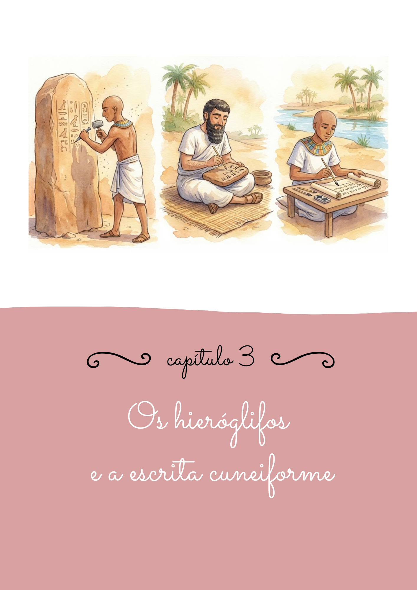 Capítulo 3 – Hieróglifos e Escrita Cuneiforme: Descubra o "superpoder" de viajar no tempo através da escrita, comparando o papiro egípcio com as tábuas de argila da Mesopotâmia.